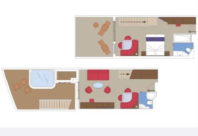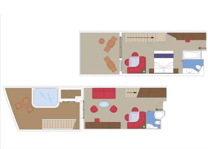 | YJD - Yacht Club Duplex Suite s vírivkou 46 m² + balkón 28-31 m². Vírivka. 2 podlažia, šatník, 2 kúpeľne (1 s vaňou). Max 4 osoby. 16. paluba. Cenový model MSC Yacht Club. | 10 211 € 10 211 € za osobu | ||